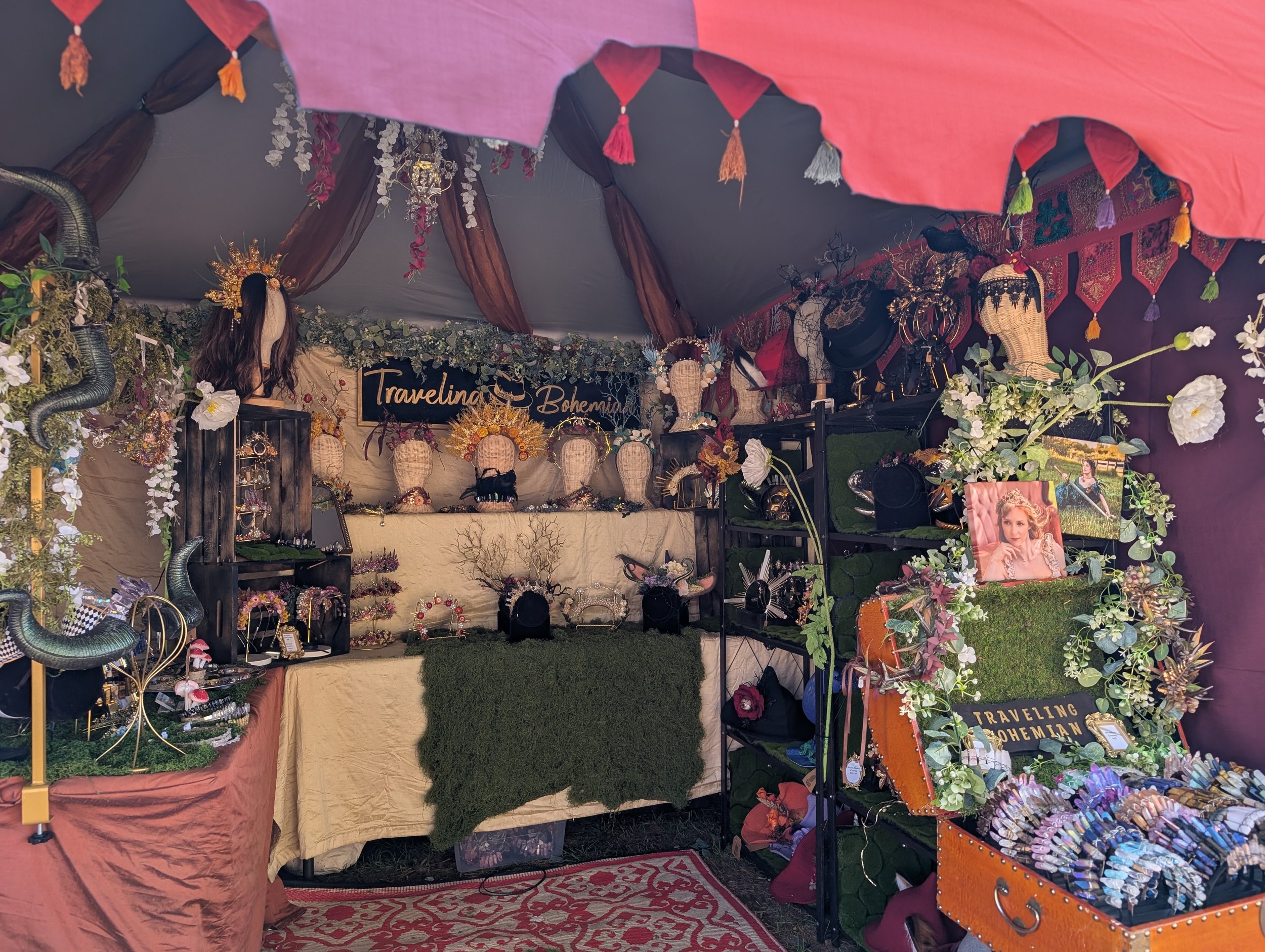 Traveling Bohemian, owned by artist Rebecca Piermarini, creates engraved hats, fantasy headpieces, and artisan jewelry for medieval and mythic worlds. Using dried flowers, crystals, gemstones, antlers, and sterling silver, each one-of-a-kind piece becomes wearable and collectible art that completes your Ren Faire look.